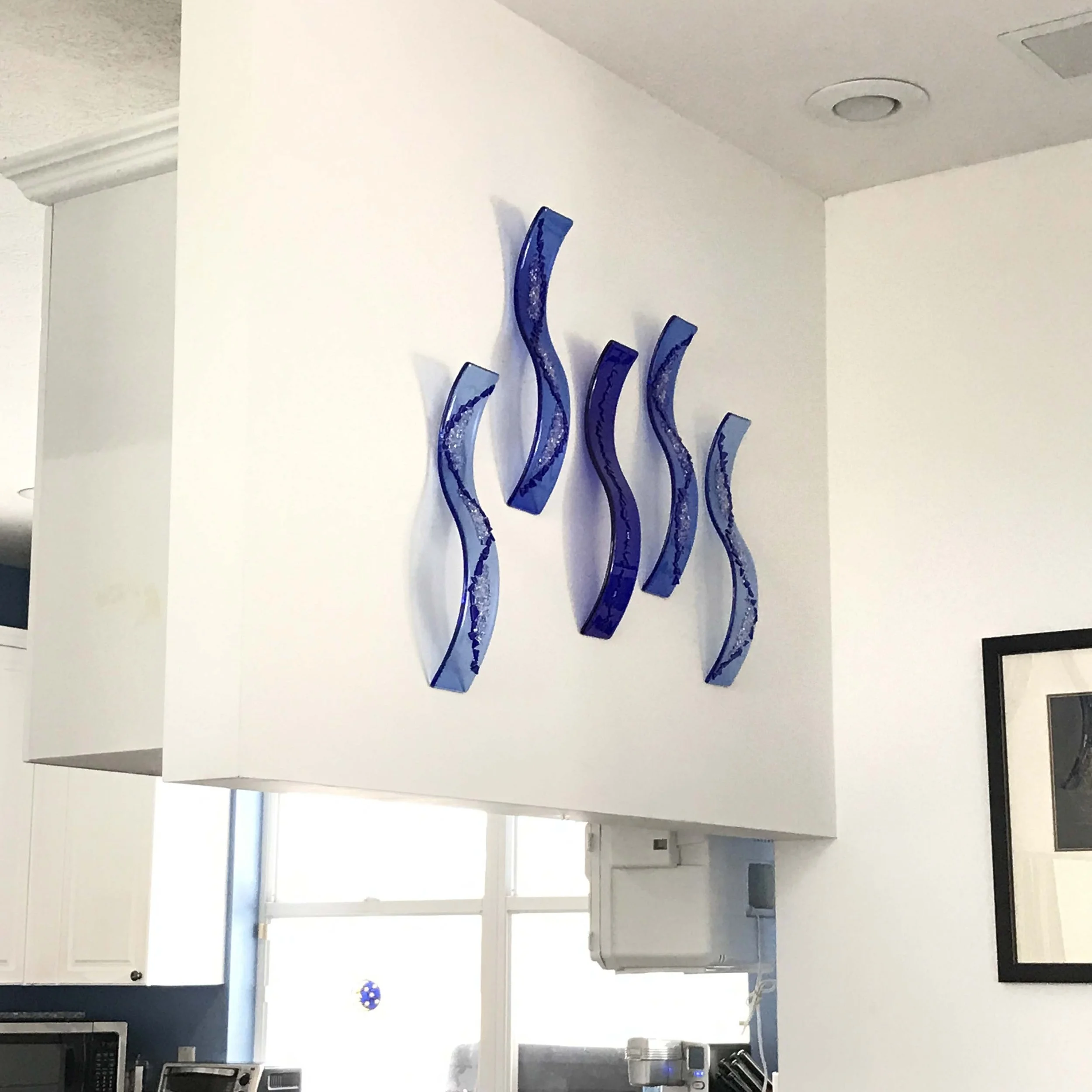 Blue fused glass wall waves with crushed glass detail, handcrafted by Dot Galfond